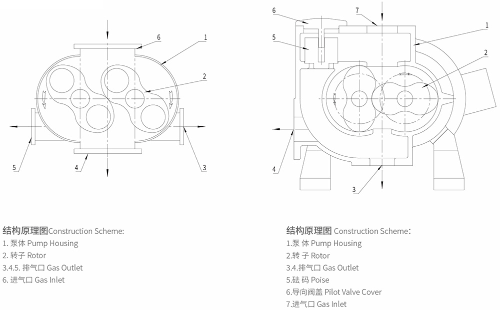 The series ZJ Roots vacuum pump is without overlow valve. The fiqure-of-eight rotors are counter-rotating at a constant speed insidethe pump housing for sucion and exhaust of gas. Two rotors are supported by two bearings and synchronized by a pair of gears,which ensure these two rotors in certain relative posiions. Thev are near to one another and to the housing without actal contactingso wbrication is unnecessary in the working housing,"he careluly balance operaling parts and high precision bevel wheels ensure thepump be operated stably and coninuously under the condiion of high-pressure diference. Dynamic seal parts use our patentechnology and imoorted oil seals. The vibralion of shalt at the shalt seals is controlled to less than 0.02mm aainst oil leaking, The "O" rings are used for sealing the pump body, two sideseries ZJ Roots vacuum pump is machined by CNC manufacturing center.covers and two end covers. All parts of pump have good compatilbilitly, so the overhaul is very easy. One-inlet and three-outletstructural design of pump is convenient for users to install and use. The pump can't be operated individually and should be used inconnection with backing vacuum pump. The screw pump, oil seal pump and water ring pump are all suitable as backing pump for Rootspump. The Roots pump can be used to pump a mass of condensable gases when it connected with screw pump or water ring pump.